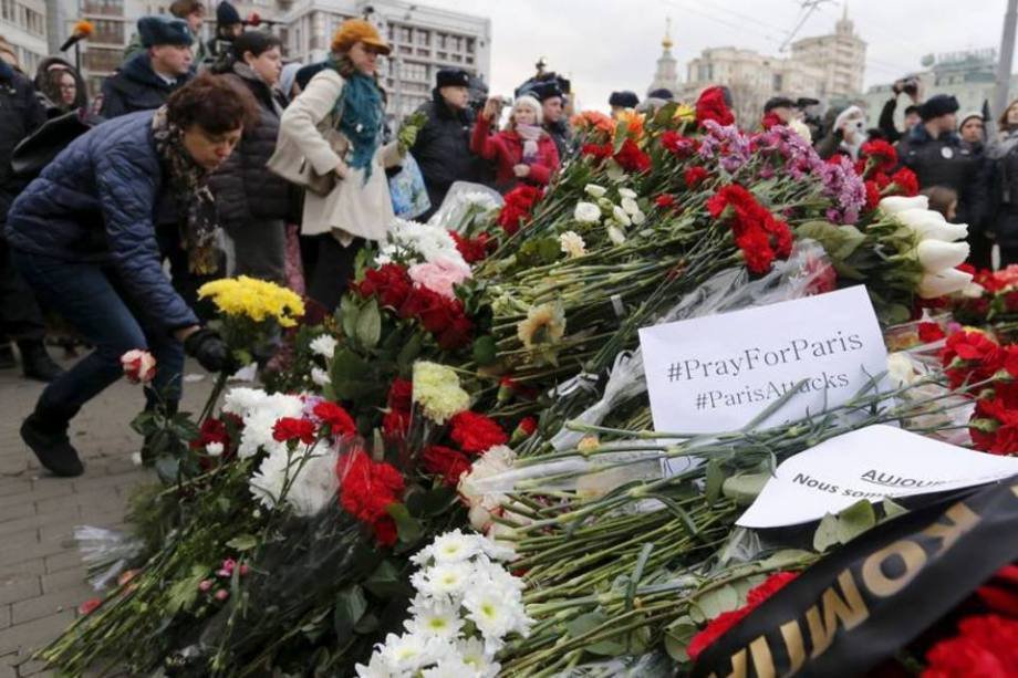 25. Mulher coloca flores em frente à embaixada em Moscou, Russia, em tributo às vítimas dos atentados terroristas a Paris, França.