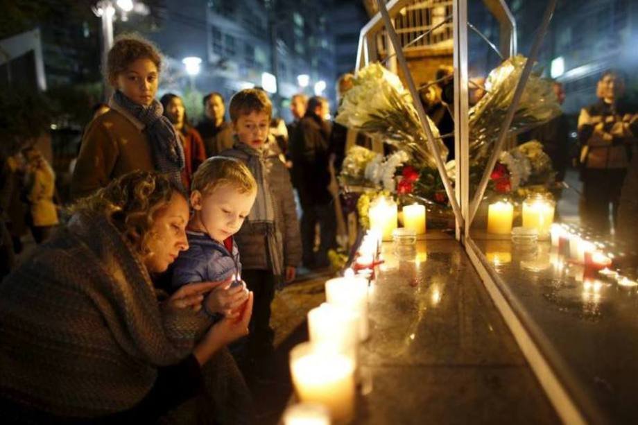 4. Mãe e filho acendem vela de tributo às vítimas dos atentados terroristas a Paris, França,em frente à embaixada em Seul, na Coreia do Sul.