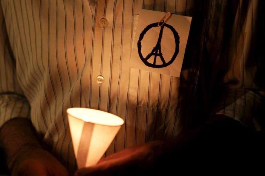 3. Homem com o símbolo estilizado da paz com a Torre Eiffel segura uma vela em tributos às vítimas dos atentados terroristas a Paris, França, em Bangcoc, Tailândia.