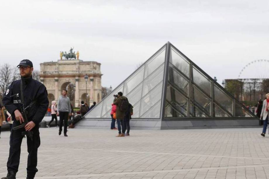 23. Policial francês patrulha as redondezas do Museu do Louvre no dia seguinte aos atentados em Paris, França.