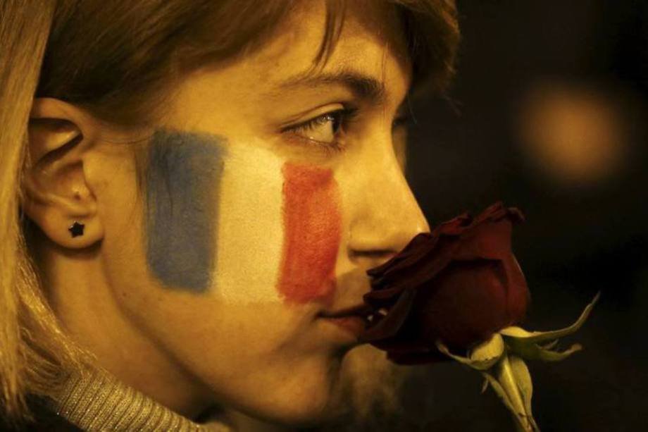 1. Mulher com bandeira a França pintada no rosto, segura uma flor durante tributo às vítimas em Tsiblisi, Georgia.