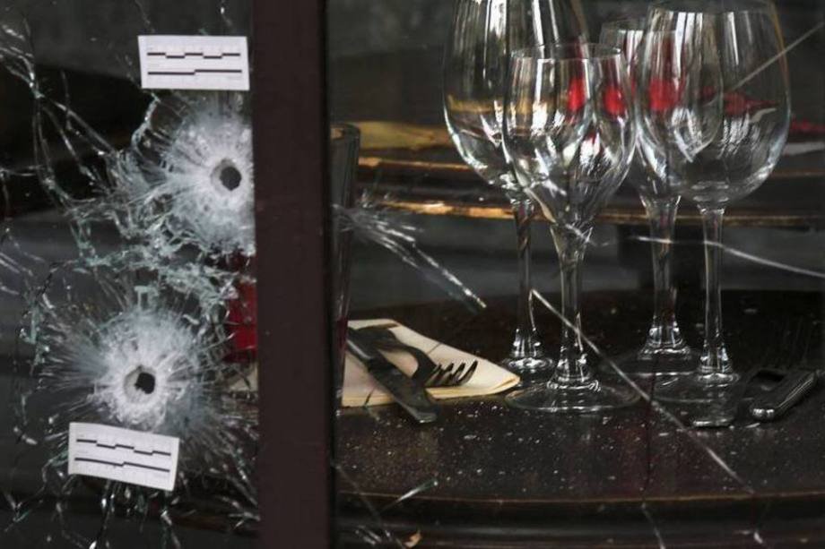 17. Buracos de bala na janela do restaurante no dia seguinte aos ataques em Paris.