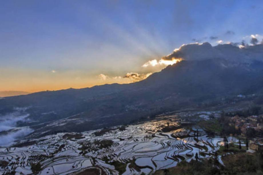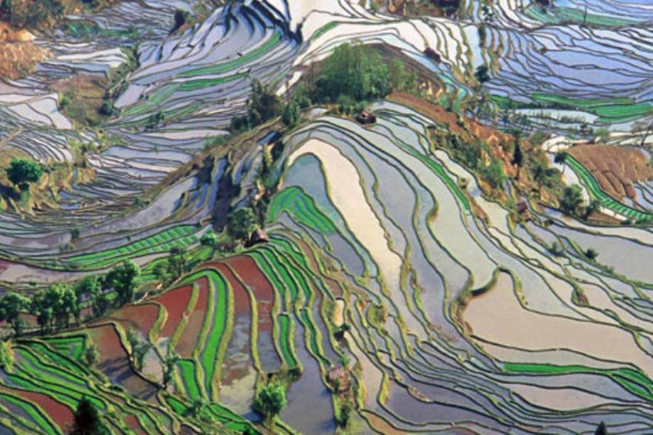 A imagem mais parece um mosaico, mas é uma parte dos terraços de arroz de Honghe Hani, na China. Esse cultivo tem mais de 1.200 anos de história e mais de 16 mil hectares de plantação, na província de Yunnan. São, ao todo, 82 vilas em que os habitantes desenvolveram um sistema que leva água à terra, para garantir a colheita periódica.