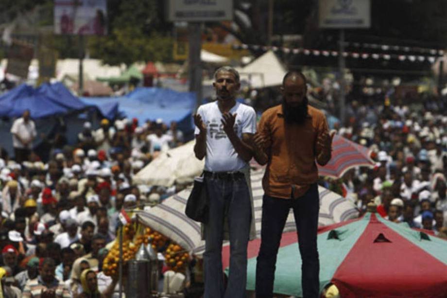7. Manifestantes a favor do presidente do Egito rezam na praça da mesquita Raba El-Adwyia