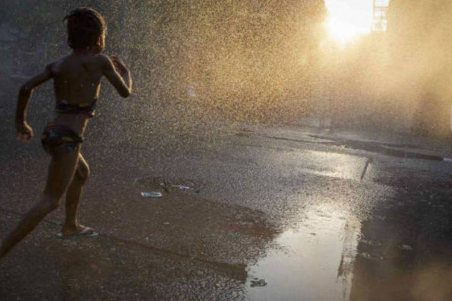9. Uma menina corre em direção a um sprinkler no Brooklyn, em Nova York. (7/7/2014)