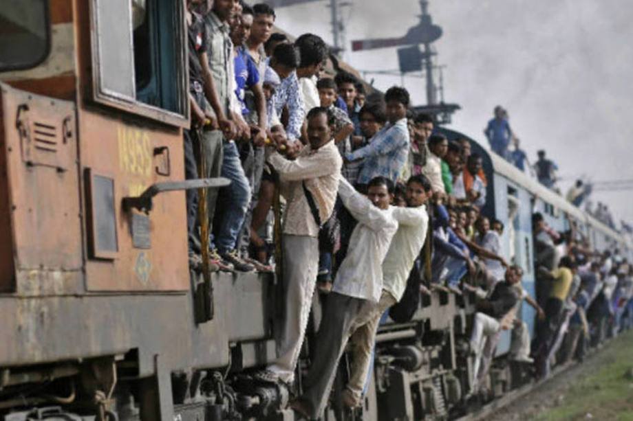 6. Pessoas se penduram na lateral de um trem em Uttar Pradesh, no norte da Índia, durante viagem. (8/7/2014)