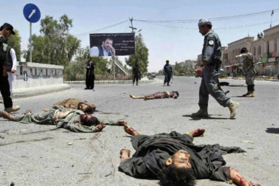 17. Policiais afegãos observam os corpos de membros do Taleban, mortos após confronto, em Kandahar. (9/7/2014)