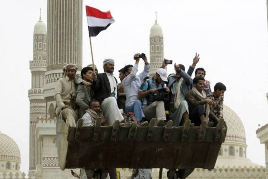 14. Em Sanaa, no Iêmen, pessoas sobem em uma escavadeira durante o funeral do General Hameed al-Qushaibi, morto durante confronto com rebeldes extremistas xiitas. (23/7/2014)