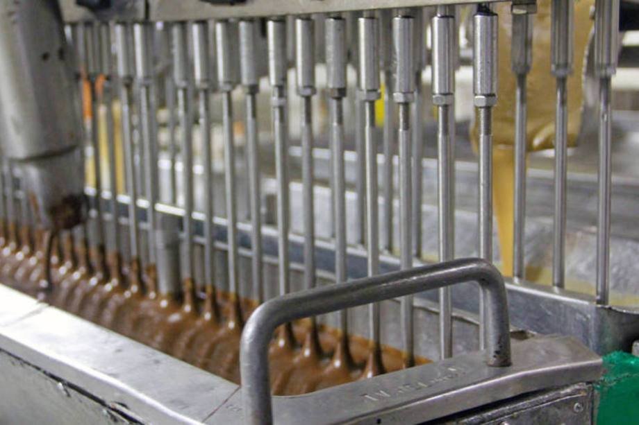 No dia da visita de Exame.com à fábrica, essa linha estava produzindo a bala Butter Toffees com recheio de chocolate. Esse ingrediente já chega pronto à fábrica e é apenas armazenado até poder ser utilizado. O caramelo e o chocolate são bombeados ao mesmo tempo dentro do molde de bala.