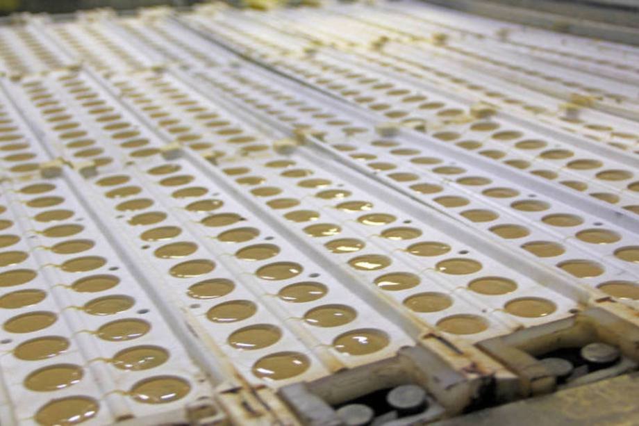 Na volta, o molde de silicone é apertado por expulsores, ferramentas como dedos que retiram a bala da forma. Nessa etapa, ela ainda está morna e muito mais macia do que a que se compra no supermercado. O sabor é suave e a bala derrete com mais facilidade na boca.