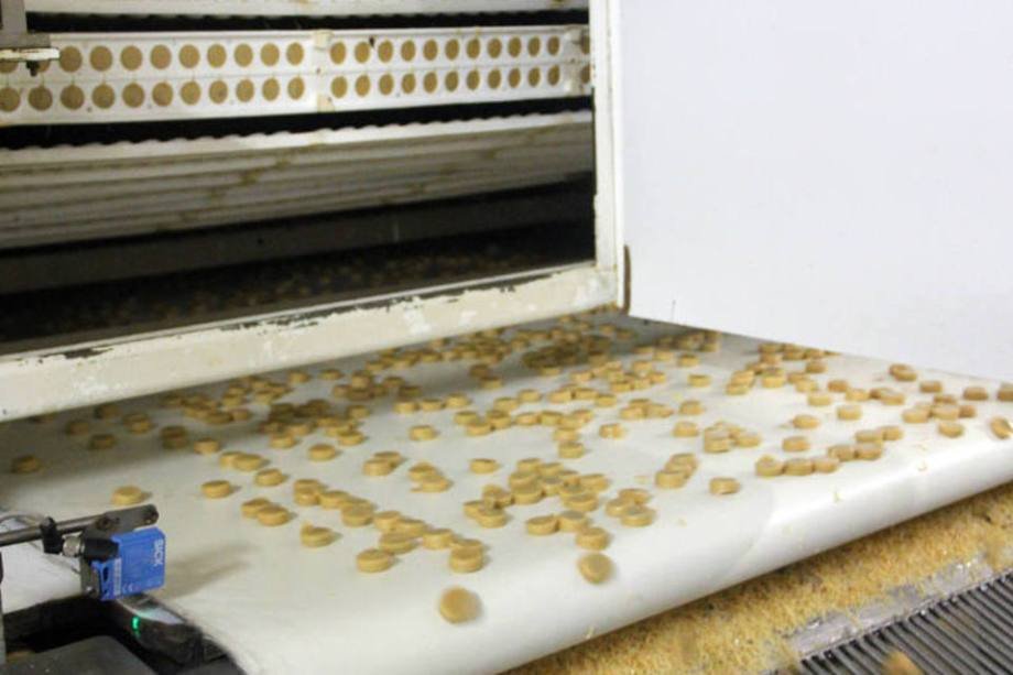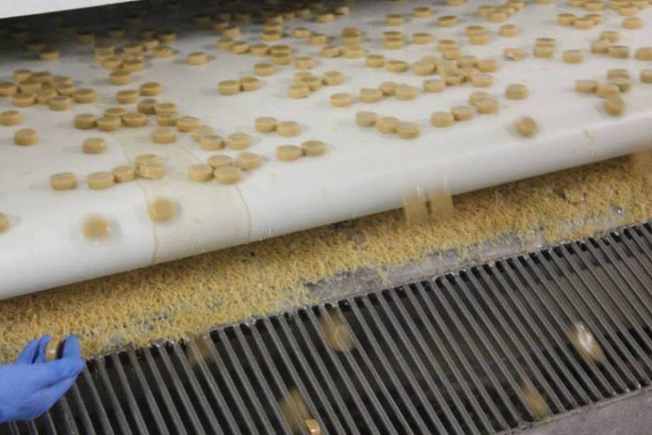 Os moldes de silicone com os docinhos recheados passarão por uma esteira de 25 metros em um túnel de resfriamento. Para economizar espaço na fábrica, a esteira vai e retorna pelo mesmo caminho.