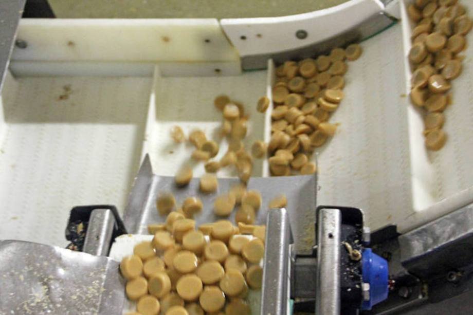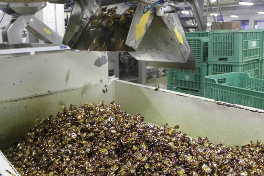 Depois de saírem da forma, os doces são direcionados para uma das seis máquinas embaladoras, que irão colocá-las nas embalagens individuais. A capacidade da fábrica é de produzir 58 mil toneladas de guloseimas, no total, por ano.
