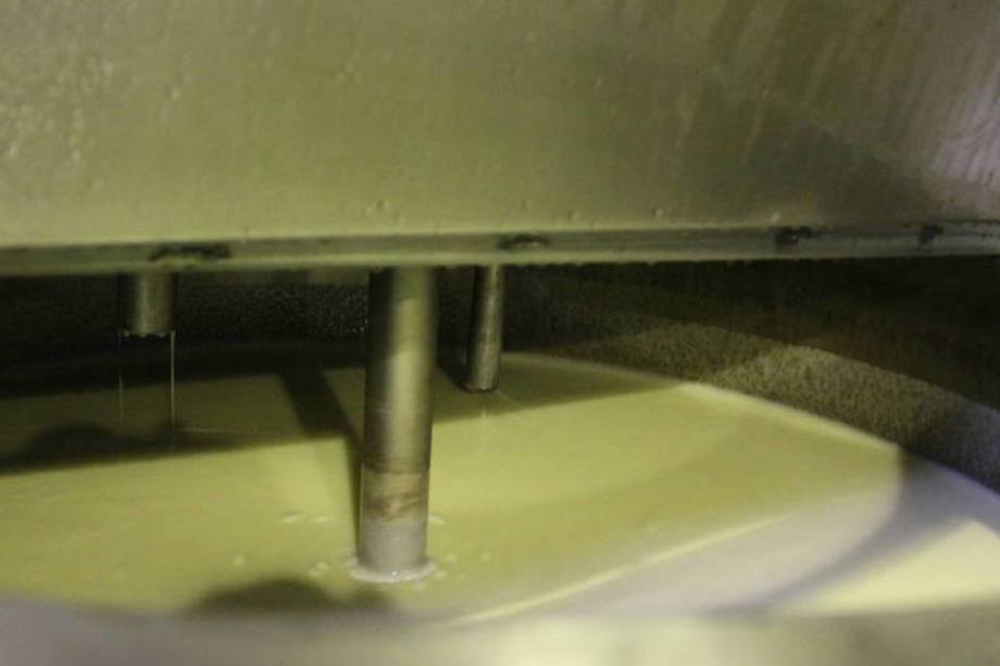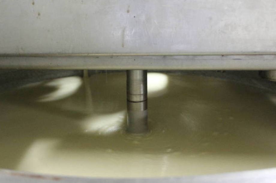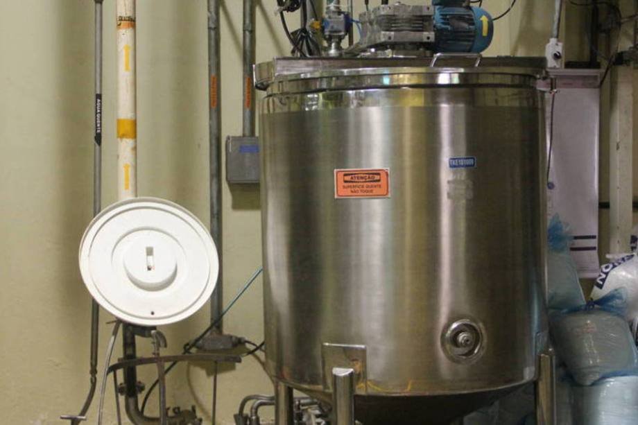 A primeira versão da calda de caramelo ainda contém muita água. Branca e quase sem cheiro, em nada lembra a guloseima. A massa é agitada nesse tanque por alguns minutos até que engrosse e alcance a textura correta.