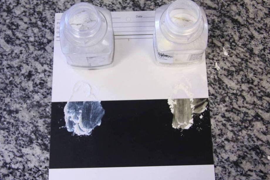 Outros tipos de pó também ajudam a deixar a cor mais interessante. O alumínio, por exemplo, deixa a cor metalizada. Já outros componentes tornam o esmalte holográfico ou 3D. Na foto, estão dois tipos diferentes de minerais que podem ser usados. Apesar de ambos parecerem brancos e iguais, o efeito de revestimento, assim como a cor e o tamanho das partículas, é bastante diferente.