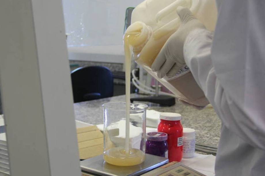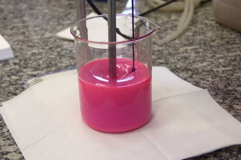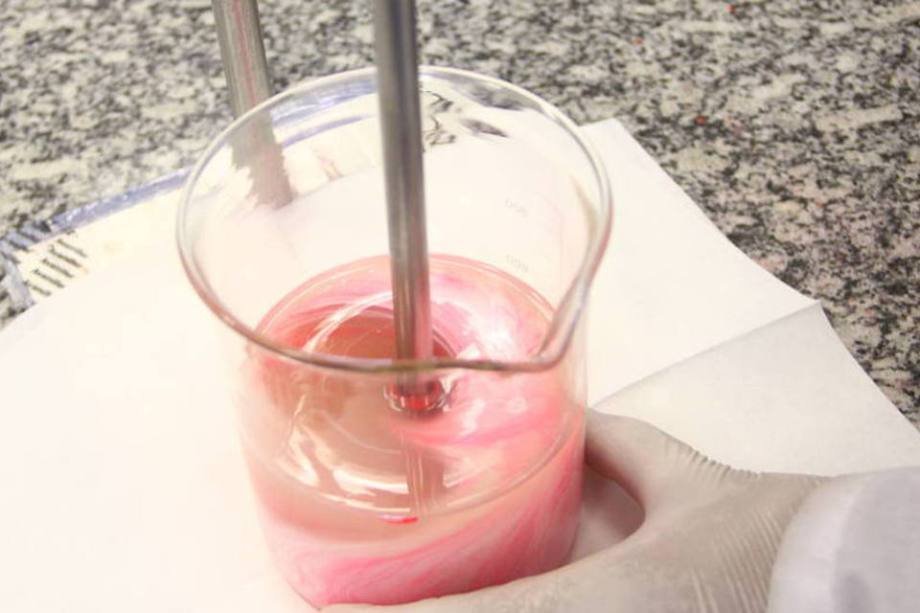 Aqui, Denis de Paula, supervisor de pesquisa e desenvolvimento, irá fazer um esmalte cor-de-rosa usando um pigmento fúcsia, roxo e um pouco de branco.