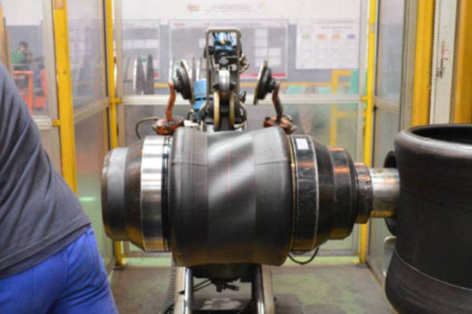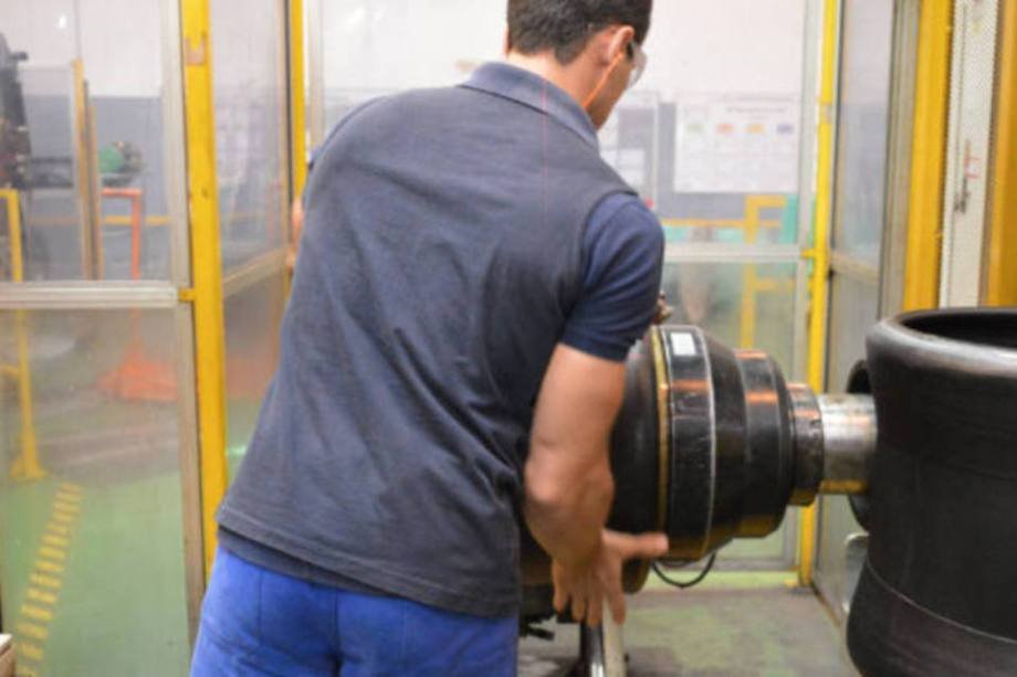 O pneu é colocado em uma máquina para receber os reforços em borracha necessários.