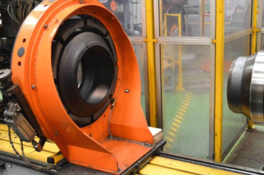 Os pneus são colocados nessas caldeiras, onde recebem uma grande quantidade de ar quente comprimido, para inflarem.