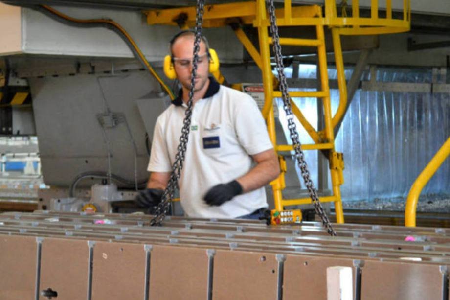 Os blocos são levados por meio de uma espécie de guindaste até as fresadoras, que farão o primeiro corte de matéria-prima.
