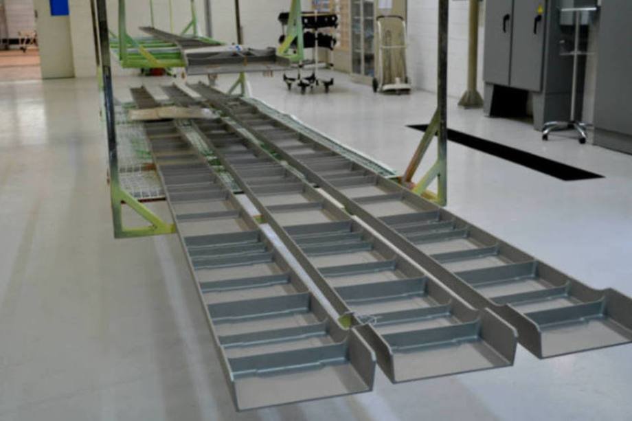 Depois de cortadas, as peças passam por uma lavagem de água e triácido para limpeza e decapagem, numa solução alcalina. Estes componentes irão iniciar a preparação para o recebimento da pintura.