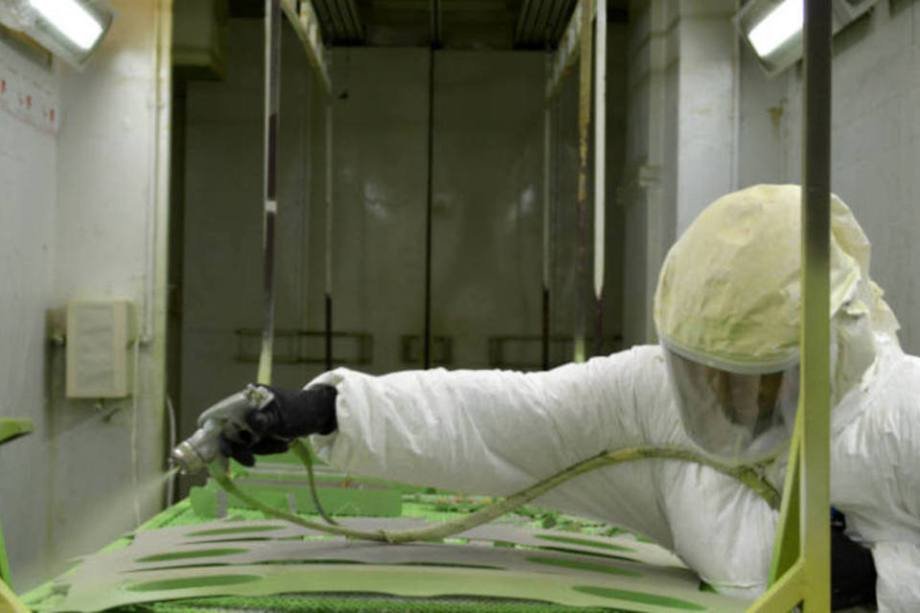 As peças recebem a camada de tinta. Para evitar que qualquer partícula danifique a pintura, os funcionários utilizam esta vestimenta. O local de pintura é fechado e há um sistema de ventilação que tanto impede que a tinta se perca quanto ajuda no processo de secagem.