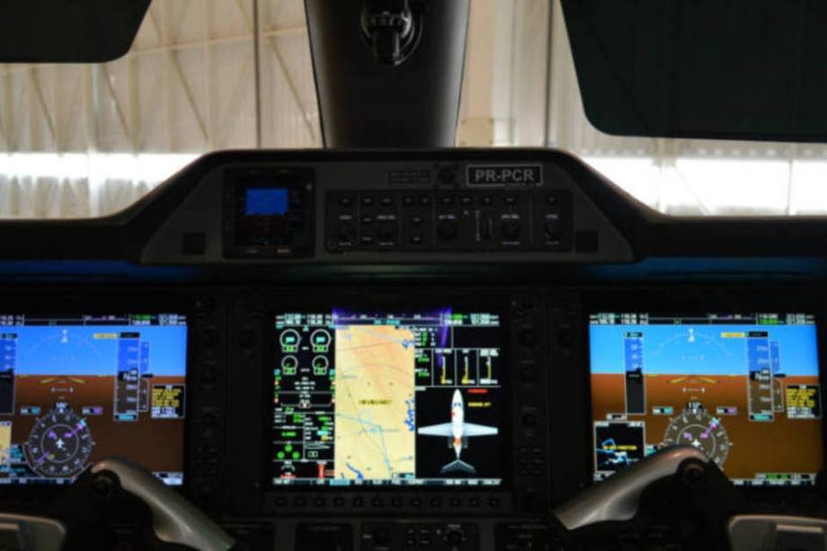 O sistema de navegação e de controle fica pronto já nessa fase do processo. O painel do Phenom 300 é inteiro computadorizado.