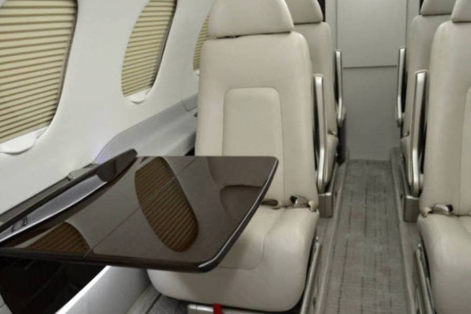 Esta é uma outra opção de decoração do Phenom 300. Para jatos maiores, como o Lineage 1000E, de 70 metros quadrados e cinco ambientes, é possível escolher entre mais de 100 opções de decoração.