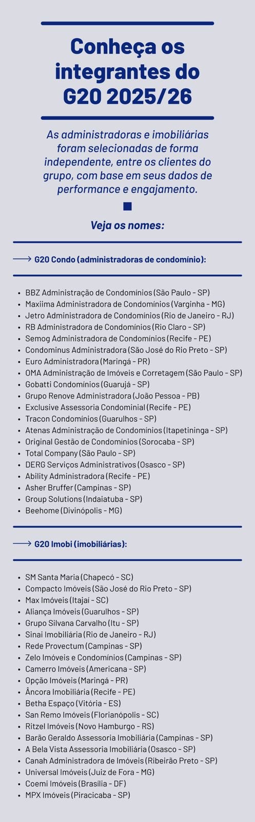 Agora, em seu novo ciclo 2025/2026, o programa reforça esse protagonismo ao reunir 40 empresas de 12 estados brasileiros — sendo 20 administradoras condominiais e 20 imobiliárias. Mais do que um reconhecimento, o G20 funciona como um conselho ativo de colaboração estratégica, em que os participantes influenciam o desenvolvimento das soluções tecnológicas e financeiras que impulsionam o mercado do morar.