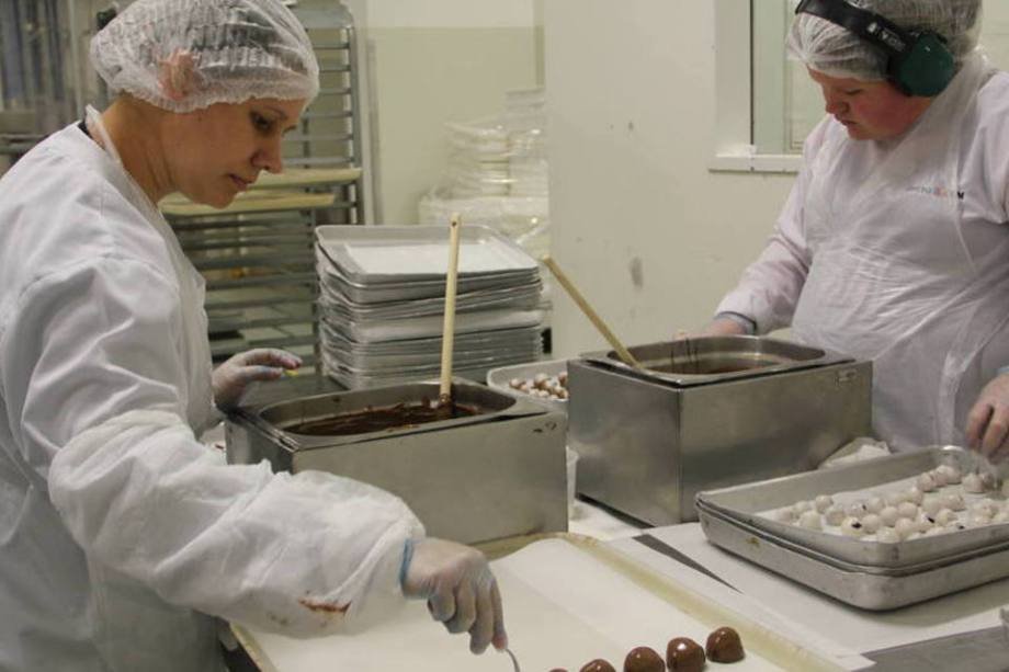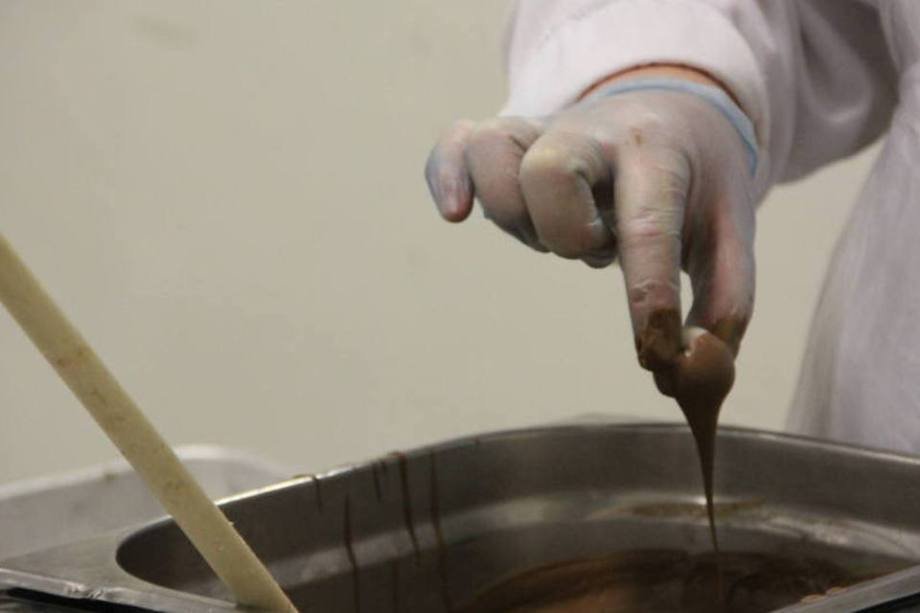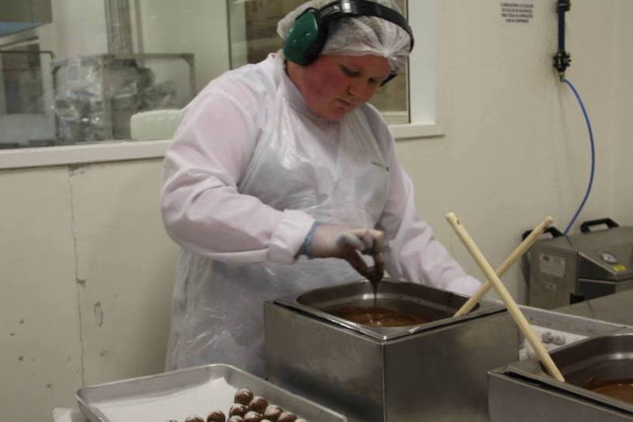 O bombom recebe o segundo banho de chocolate, para finalizar o doce. As funcionárias cobrem mais de 350kg de bombons por dia.