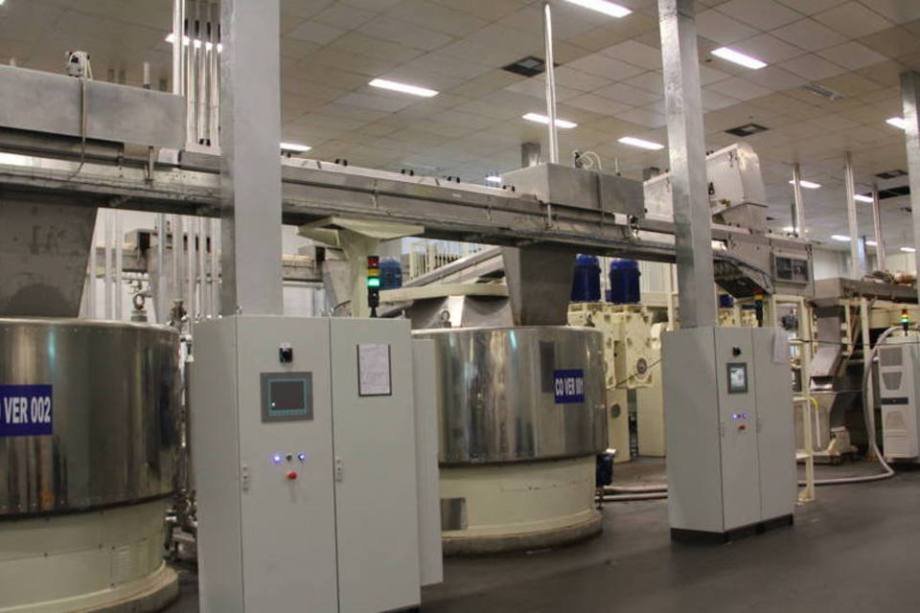 Na central de produção de massas, vários tanques de 200 kg a 6 toneladas produzem mais de seis tipos de massa. Chocolates ao leite, branco, amargo, 70% cacau, diet e puro cacau saem daqui e se dirigem para toda a fábrica. Além desses sabores, as massas também podem ser aromatizadas, com laranja ou menta, por exemplo, ou receber frutas nesse momento.