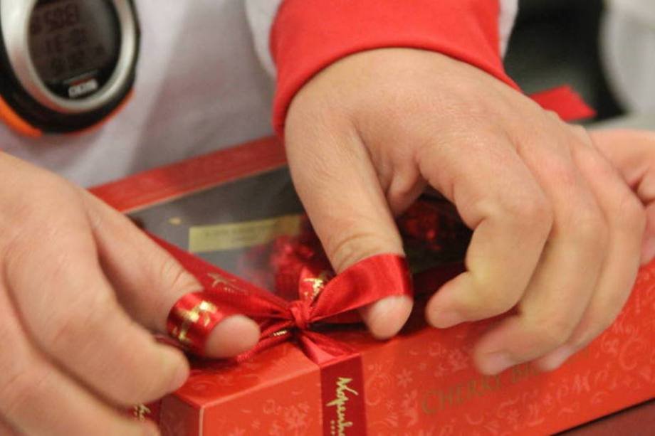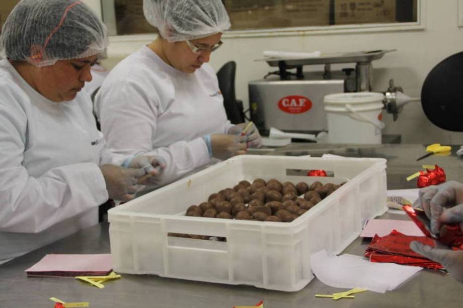 A embalagem também é manual, como não podia deixar de ser. Cada colaboradora precisa embalar 5kg de bombons por hora.