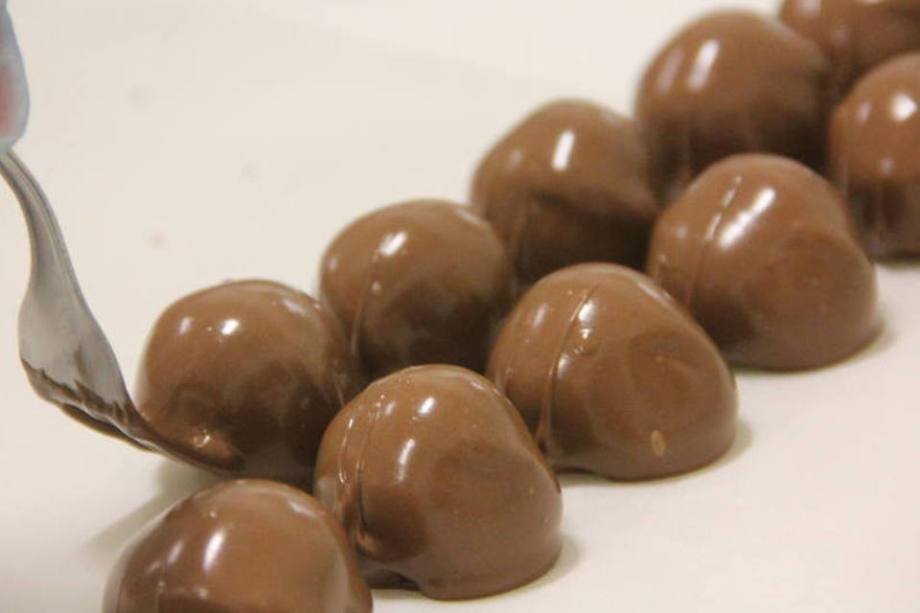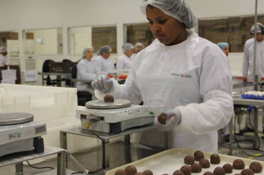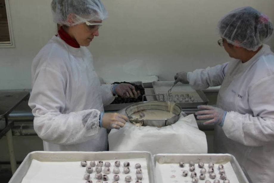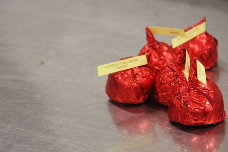 Cerejas e chocolate chegam ao setor de produtos artesanais. As cerejas recebem dois banhos de fondant, que é misturado com creme de licor e conhaque. A funcionária coloca a cereja no creme com um aro e, para tirar o excesso, dá três batidinhas na borda do pote.