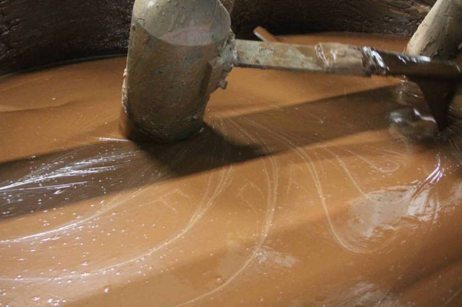 O cacau, açúcar cristal, leite em pó e manteiga de cacau são misturados e derretidos. Formam uma pasta grossa, que é a primeira etapa do que será, no futuro, o chocolate.