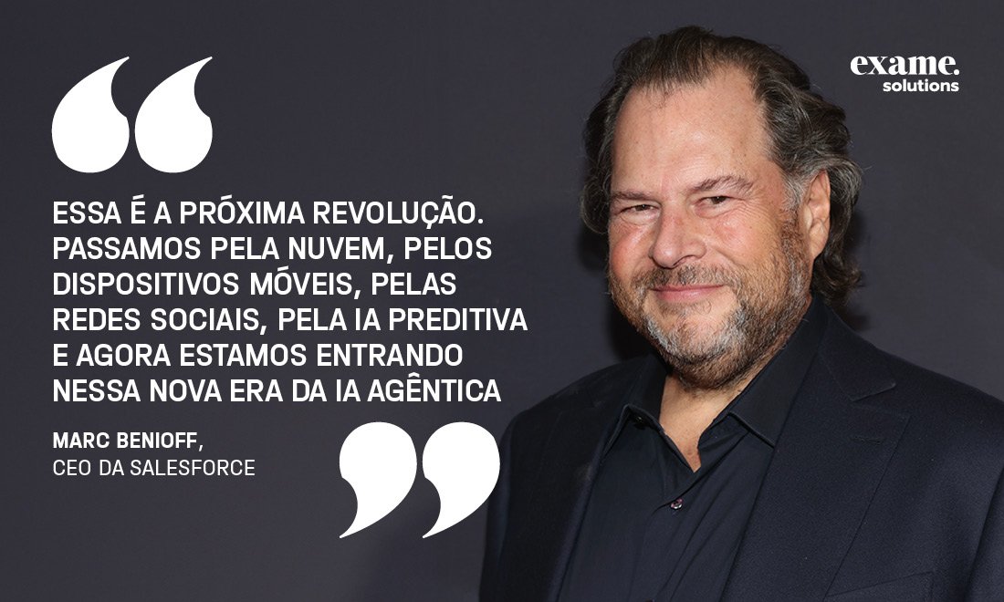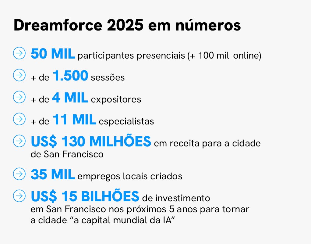 Em 2025, a IA continua sendo o assunto principal do evento, mas em um contexto mais amplo. Segundo Marc Benioff, CEO da Salesforce, estamos entrando em uma terceira onda da IA, marcada pela consolidação dos agentes autônomos. A ênfase agora não é apenas na automação de processos, mas na construção de um novo modelo corporativo no qual esses agentes são capazes de agir sozinhos, inclusive na tomada de decisões.
