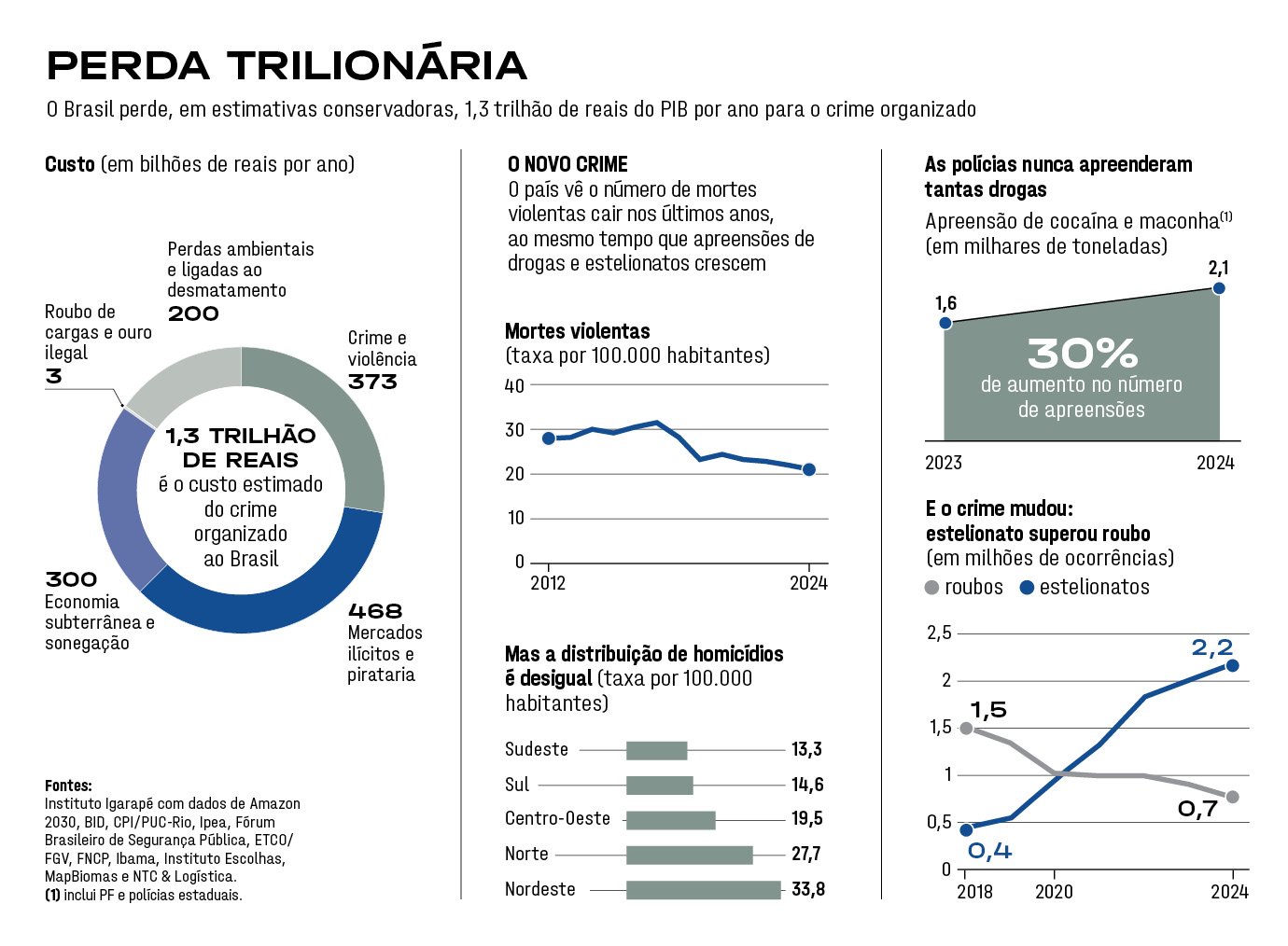 “Esse é o imposto oculto da ilegalidade. Ele não apenas custa vidas, mas reduz a produtividade, desestimula investimentos e pesa mais sobre os pobres”, afirma Muggah. “O ponto central é que o crime no Brasil não é apenas um problema de segurança pública. É um problema macroeconômico.”