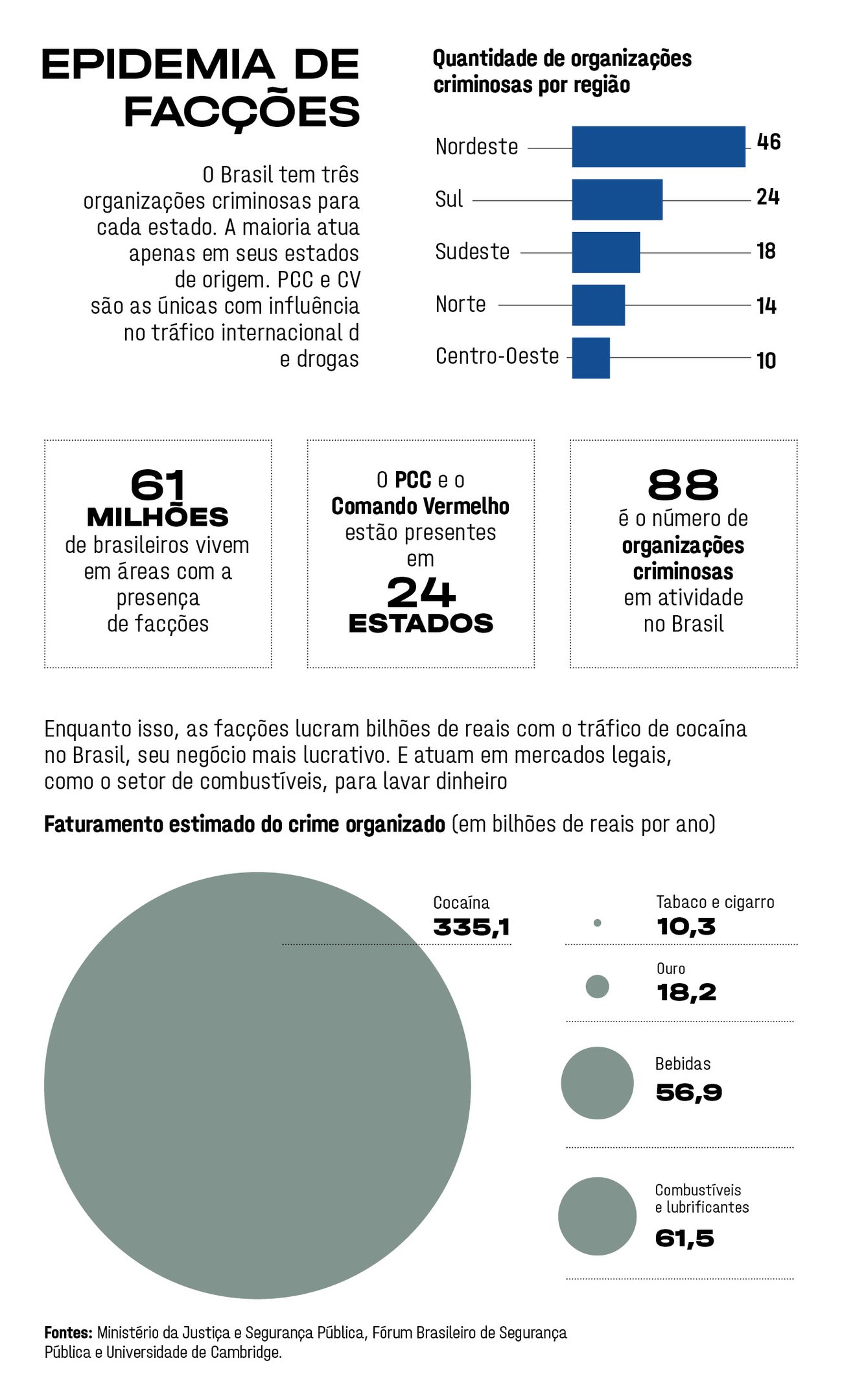 Essa não é uma questão menor. As estimativas divergem, mas um estudo da Universidade de Cambridge sugere que 60 milhões de brasileiros vivem em áreas dominadas por facções criminosas. São 88 delas, segundo o Ministério da Justiça e Segurança Pública. As maiores, o Primeiro Comando da Capital (PCC) e o Comando Vermelho (CV), atuam em praticamente todos os estados e têm forte influência no tráfico internacional de drogas. Não à toa, o tema se tornou ainda mais central na agenda do país: de acordo com uma pesquisa Quaest/Genial, a parcela da população que aponta a violência como principal preocupação subiu de 30% para 38% de setembro para outubro. Outra pesquisa, da Atlas/Intel, mostrou que mais de 80% dos moradores de favelas em todo o país apoiaram a ação no Rio. “A aprovação da população a operações como a do Rio é emblemática e um pedido de socorro. As facções tomaram conta do dia a dia das pessoas”, afirma Renato Sérgio de Lima, diretor-presidente do Fórum Brasileiro de Segurança Pública (FBSP).