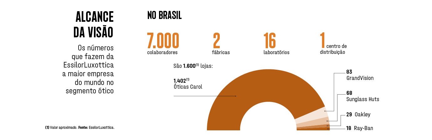 Mais do que uma loja, a GrandOptical é um símbolo de todo o universo da EssilorLuxottica. A maior empresa do mundo no segmento tem uma organização verticalizada, que vai de pesquisa e desenvolvimento de materiais, fabricação dos equipamentos, armações e lentes, até a distribuição e venda final de produtos. A companhia possui 18.000 pontos de venda espalhados pelo mundo, entre multimarcas globais como a própria GrandOptical, além de lojas de marcas próprias como Ray-Ban e Oakley. Somente no Brasil operam por volta de 1.600 pontos de venda do grupo, com destaque para a Óticas Carol, com 1.400 estabelecimentos.