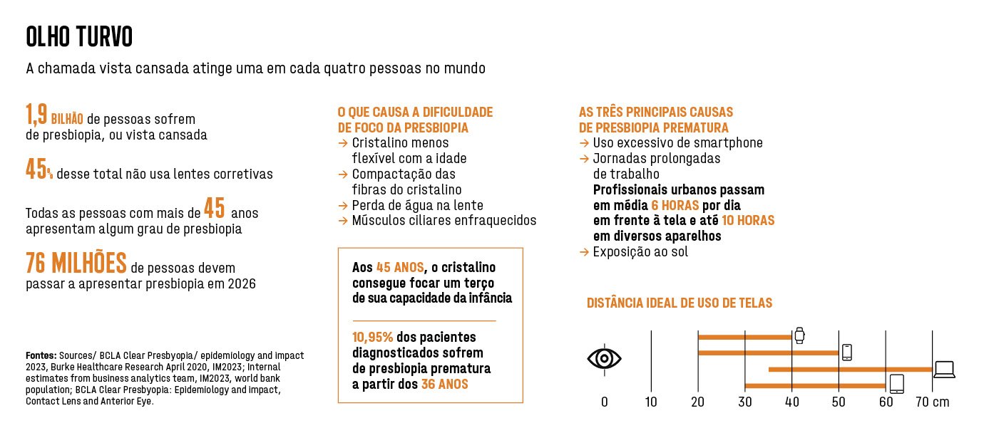 A EssilorLuxottica opera 150 marcas próprias, entre lentes, armações e redes de varejo. Conta com 200.000 colaboradores em 150 países e 650 instalações operacionais. A cada ano, produz 560 milhões de lentes e 116 milhões de armações. Uma de suas marcas de lentes mais conhecidas é a multifocal Varilux. Lançada em 1959, é indicada para a -correção de presbiopia. O nome rebuscado tem um sinônimo fácil de entender para quem já passou da meia-idade: vista cansada, a dificuldade de fazer foco em distâncias curtas. Esse é um mercado endereçável enorme. Todo mundo, depois dos 45 anos, vai apresentar algum grau de presbiopia. Hoje, estima-se que 1,9 bilhão de pessoas sofra de vista cansada. “Com o envelhecimento da população, a tendência é que cada vez mais pessoas venham a ter problemas de visão”, afirma Valérie Parmentier, gerente da equipe de pesquisa em presbiopia e envelhecimento. O departamento sob seu comando conta com parceiros globais como o World Council of Optometry. “Estamos sempre tentando entender modelos de comportamento, como atualmente o uso excessivo de telas, para estabelecer novos padrões de tratamento.”