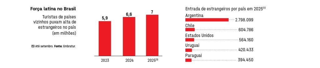 O Brasil nunca recebeu tantos turistas estrangeiros. De janeiro a setembro, foram 7 milhões, segundo a Embratur. É o maior volume para um ano na história. Em 2024 inteiro, foram 6,65 milhões. A maioria veio de países vizinhos.