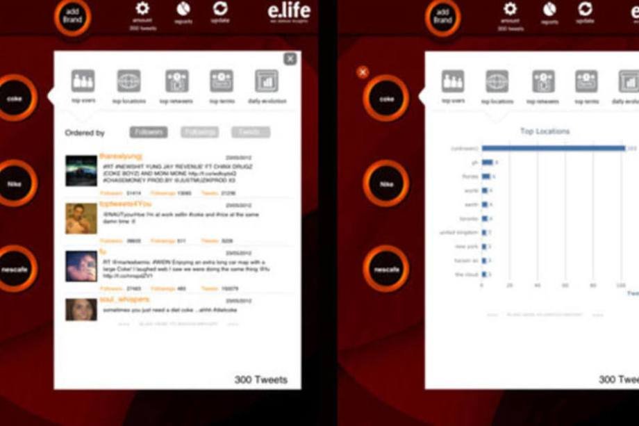 Disponível em: iPad e Android Preço: Gratuito Descrição: O app desenvolvido pela equipe do próprio CEO da e.Life monitora a atividade de termos específicos nas principais redes sociais. Com ele, empreendedores podem ter acesso, por exemplo, a reação de seus consumidores ao lançamento de novos produtos e serviços da sua empresa. Os relatórios podem ser visualizados em tempo real.