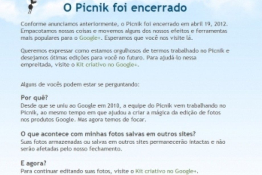 Este não foi uma criação do Google, mas sim uma aquisição. E nem foi de fato encerrado, mas sim integrado ao Google Plus em 2012 a atual rede social preferida da empresa conta com um recurso de edição de fotos integrado, herdado do Picnik.