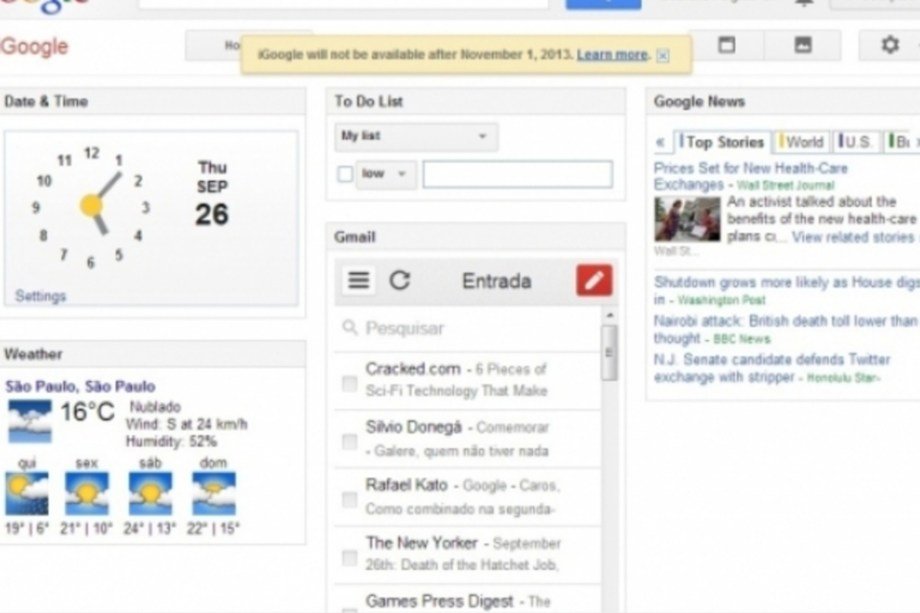 O iGoogle ainda não foi descontinuado, mas a mensagem na tela inicial deixa claro: iGoogle não estará mais disponível depois de 1º de novembro de 2013. A ideia do serviço é ser uma homepage personalizada, que traz calendário, relógio, lista de afazeres, e-mail e notícias fornecidas pelo próprio Google. É útil, mas, para a empresa, parece já não ter mais tanto sentido atualmente, já que apps para Android e Chrome fazem a mesma função e até de forma melhor.