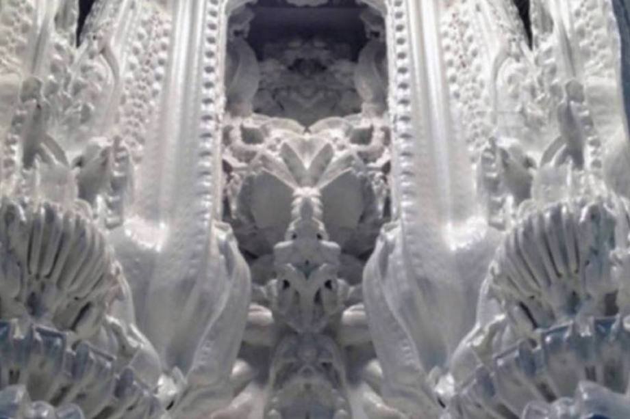 12/12  (Divulgação) 	Um grupo de artistas imprimiu uma sala que parece uma catedral alienígena. Chamada de “Digital Grotesque” (grotesco digital, em tradução para português), o ambiente parece ter saído de filmes de ficção científica.	A sala foi criada com um algoritmo que divide e repete formas vistas no trabalho do artista surrealista suíço H. R. Giger. O artista ganhou um Oscar pelo seu trabalho na equipe de efeitos visuais do filme Alien, o 8º Passageiro.	O algoritmo foi desenvolvido inspirado também pelo processo natural de divisão celular. Divide e transforma a geometria de um cubo. Os designers dizem que o produto do algoritmo não é “totalmente previsível”, o que dá origem a um mundo complexo de formas que criam um verdadeiro “grotesco digital”. Os designers dizem que essa é a primeira sala impressa em 3D totalmente em arenito.