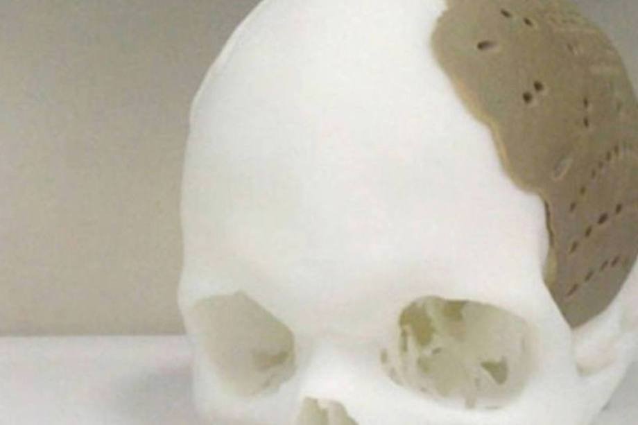 1/12  (Oxford Performance Materials) 	Um homem americano teve 75% do seu crânio substituído por uma prótese feita em impressora 3D. O implante realizado pela primeira vez no mundo foi comandado pela empresa Oxford Performance Materials.	A empresa foi a responsável por fabricar o material da prótese. Em fevereiro, a equipe recebeu autorização do governo dos Estados Unidos para fornecer ossos feitos em impressora 3D.	A réplica é feita de polietercetonacetona (ou PEKK), que provou ser o material adequado para implantes humanos. A prótese tem uma textura especial e furos com o objetivo de estimular o crescimento natural das células e dos ossos do paciente.	A empresa acredita que este tipo de implante também pode ser usado para reparar outras áreas comprometidas do corpo por algum traumatismo, como braços e pernas. Pacientes com tumor ósseo e vítimas de acidentes de carro estão no grupo de pessoas que podem ser ajudadas com essa nova tecnologia.