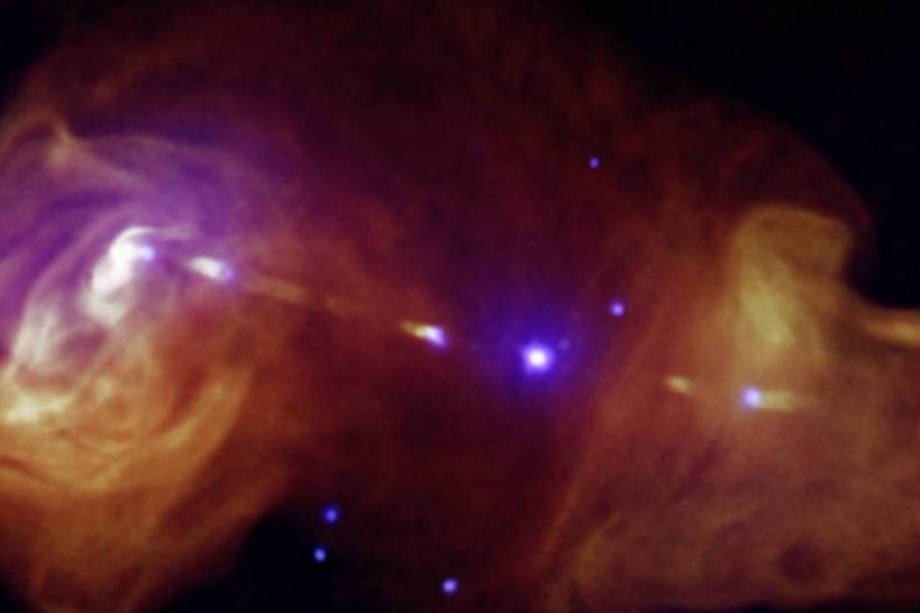 Jatos gerados a partir de buracos negros supermassivos no centro das galáxias podem transportar grandes quantidades de energia. Um exemplo desse tipo de jato pode ser visto na imagem acima. A galáxia está ao centro e grandes nuvens de radiação podem ser vistas em roxo