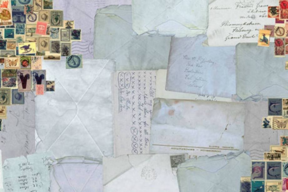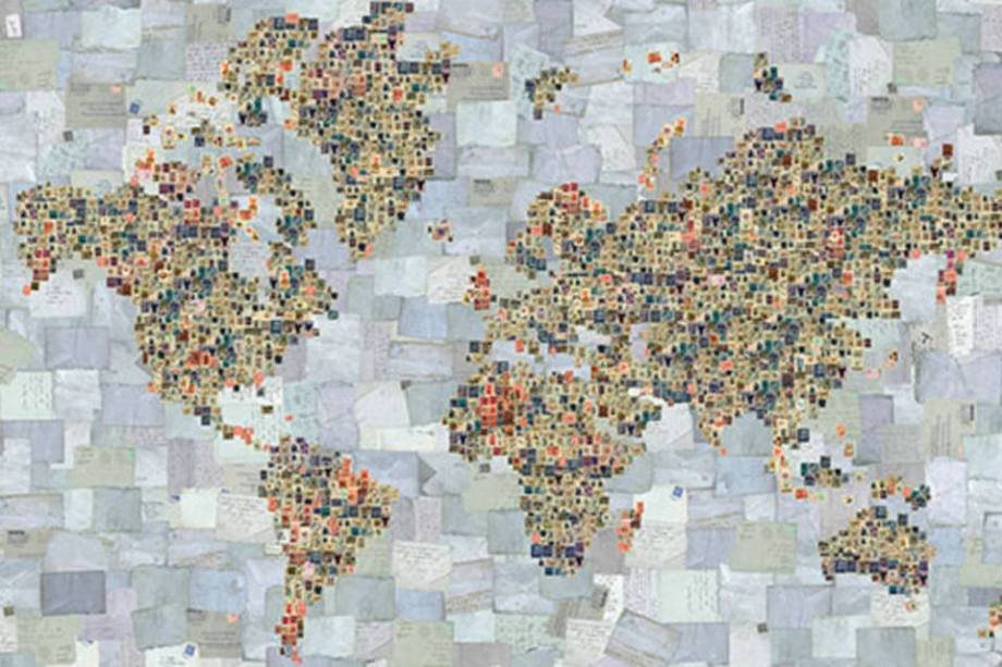 3. Detalhe do papel de parede Stamp World Map, feito de envelopes e selos de cartas, por Paul Smith