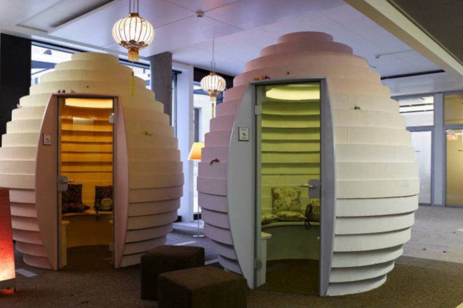 15/19  (Luísa Melo/EXAME.com) 	Ao todo, são sete salas. Duas delas, usadas para reuniões maiores, são exceção e ficam nas extremidades. Na foto, funcionários fazem conferência por telefone. 	O objetivo de concentrar os espaços fechados e deixar os abertos interligados é facilitar a comunicação entre as pessoas e aproveitar a luz natural, segundo a companhia.