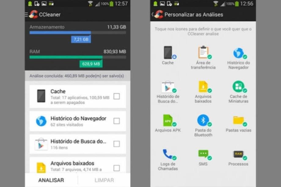 O CCleaner é um programa popular entre usuários de Windows e Mac por permitir a limpeza do sistema e melhorar seu desempenho. Quem tem dispositivo com Android agora pode aproveitar a solução da Piriform para deixar o celular ou o tablet também mais ágil. Quando executado, ele abre a ferramenta Limpador, que exibe o total de espaço ocupado no armazenamento e na RAM do dispositivo. Se você tocar no botão Analisar, o app varrerá todo o sistema, indicando os itens que podem ser removidos e o total de espaço que poderá ser recuperado. Entre os itens que podem ser removidos, ele lista cache de aplicativos, cache de miniaturas, arquivos baixados, arquivos APK, histórico do navegador, histórico de buscas, pastas vazias, registros de chamadas, SMS e processos. Marque o que quer eliminar e execute a limpeza.