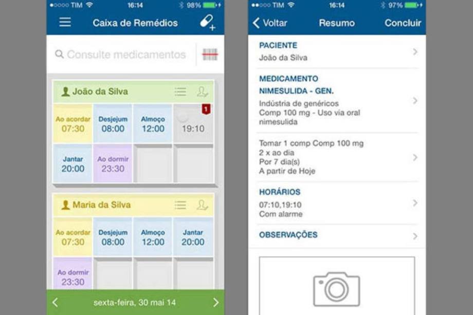iPhone	Caixa de Remédios é um calendário de medicamentos que lembra quando é hora de tomar algum remédio. Ele permite identificar o medicamento fotografando o código de barras na embalagem ou digitando seu nome. Além de emitir lembretes, o app exibe alguns dados sobre o produto e permite pesquisar seu preço em farmácias online. Pode-se, ainda, fotografar a receita e armazená-la no app.