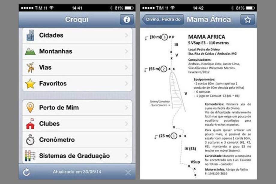 iPhone/iPad (0,99 dólar)	Croqui é um app para praticantes de alpinismo. Ele dá acesso aos croquis de mais de mil vias de escalada em rocha, a maioria no estado do Rio de Janeiro. O app é útil, mas é um tanto tosco. Não é possível pesquisar vias pelo grau de dificuldade, por exemplo. Depois de instalá-lo, é preciso tocar no botão Atualizar (no rodapé do menu) para baixar os dados.