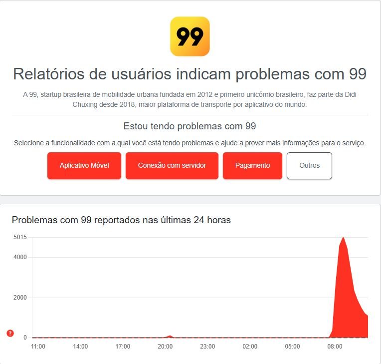 De acordo com a 99, houve uma interrupção inesperada no sistema, afetando alguns usuários. A empresa afirmou que as equipes técnicas estão trabalhando com urgência para resolver o problema e os serviços estão sendo "gradualmente estabelecidos".